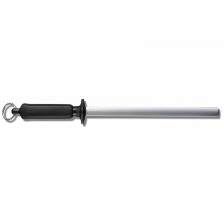 Brúska na kuchynské nože Victorinox Kitchen Sharpening Steel s oválnym brusivom vyrobená z priemyselného diamantu, plastovou rukoväťou a krúžkom na zavesenie. Dĺžka brusiva 23 cm.