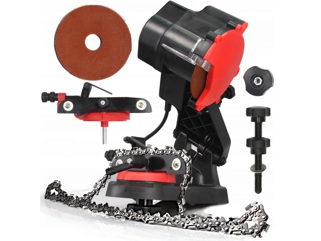 Bruska- ostřička řetězů elektrická, s brousícím kotoučem. Velmi lehká a oblíbená bruska pro ostření řetězů různých značek a typů.