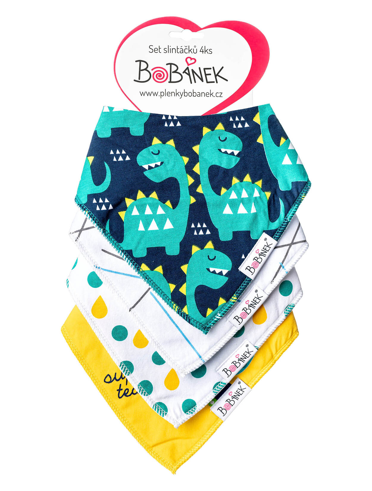 Set 4 slintáčků s motivem dinosaurů je ideálním pomocníkem pro každodenní péči o vaše miminko. Už žádné promočené oblečení - slintáčky ochrání oblečení malých prcků a zároveň skvěle vypadají díky veselým dinosauřím vzorům.