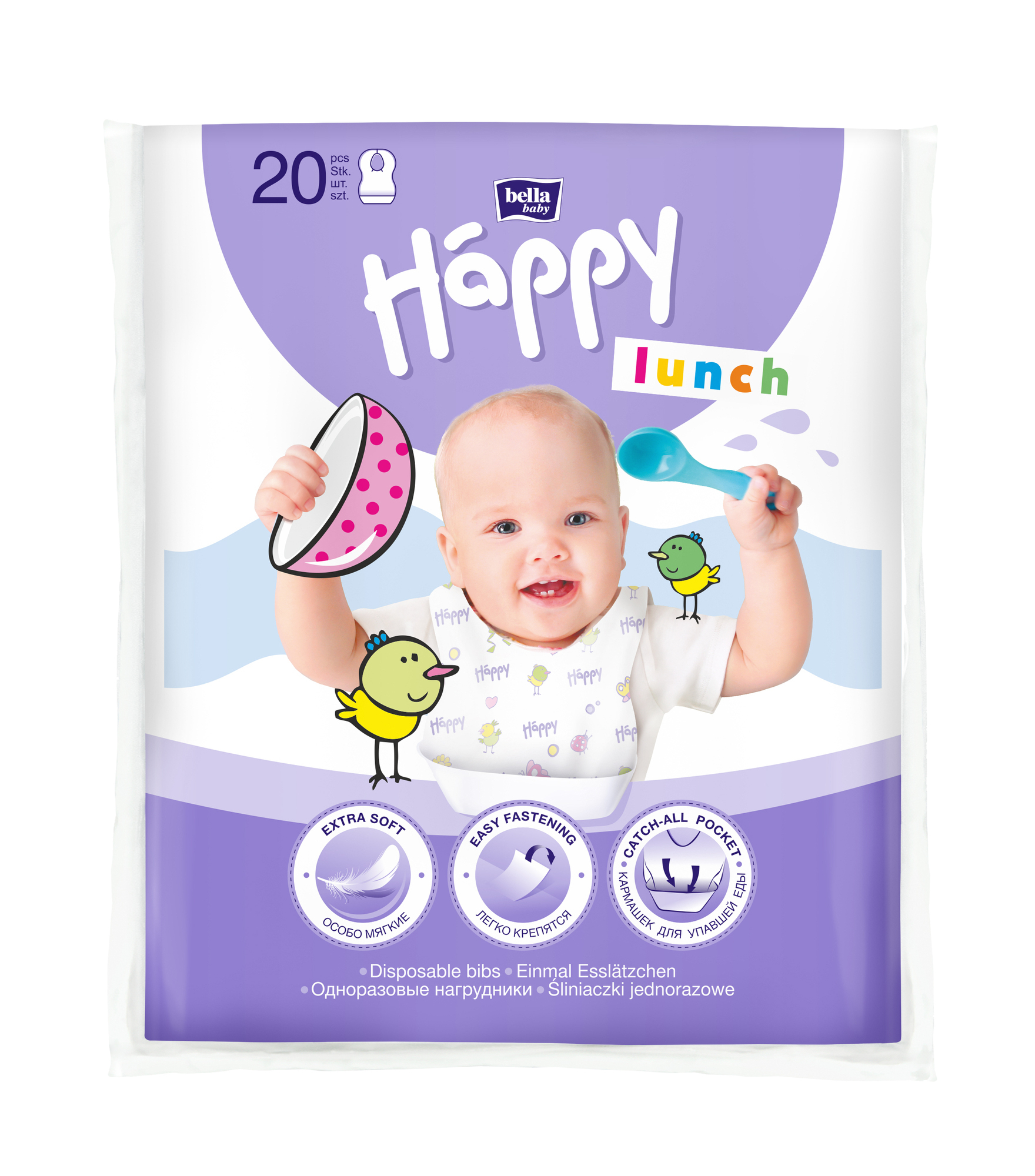 Jednorázové bryndáčky Happy Lunch jsou dokonalou alternativou látkových bryndáčků. Vnější savá vrstva z netkané textilie spolu se zadní fóliovou vrstvou skvěle chrání oděv dítěte před znečištěním.