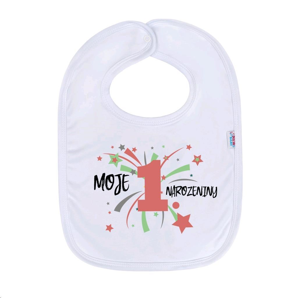 Krásný bavlněný dětský bryndáček s vtipným obrázkem New Baby. Bryndáček je zdoben nápisem Moje 1 narozeniny. Barvy použité k potisku jsou certifikované a vhodné pro miminka. Je vyroben z příjemného a kvalitního materiálu. Bryndáček má bílé lemování a je vyroben ze dvou vrstev bavlněné látky. Zapínání na cvoček. Dětský bryndáček chrání oblečení miminka před znečištěním při jídle a pití. Složení: 100 % bavlna. Rozměry: dxs cca 36x26 cm.