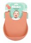 Bryndák z jemného, pružného silikonu je vybaven širokou kapsou pro zachycení drobečků i kapek. Dokonale ochrání oblečení dítěte již od prvních pokusů o samostatné stolování. Zapínání za krkem umožňuje snadno upravit velikost kolem krku.