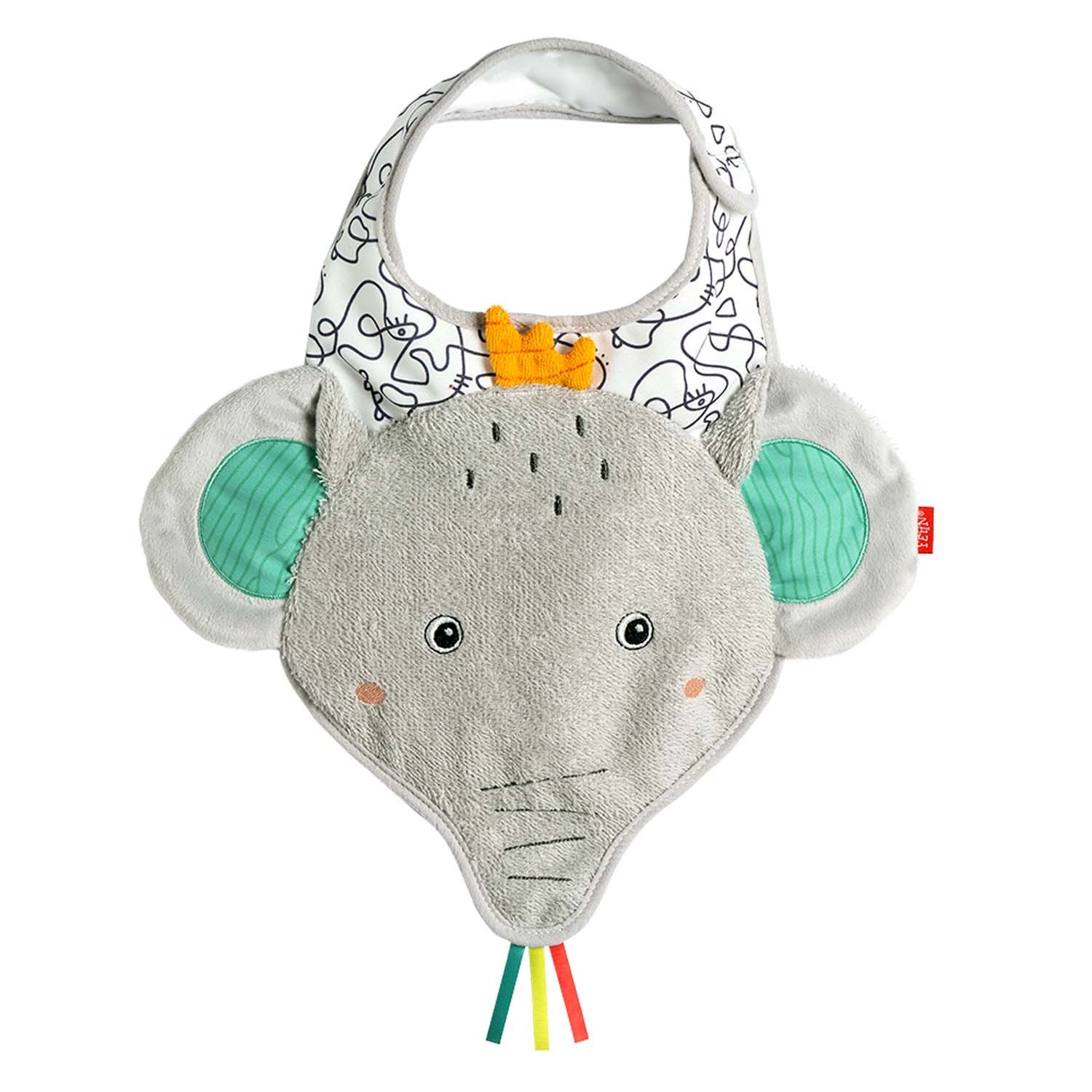 Šedý bryndáček z froté ve tvaru slona nabízí optimální ochranu při jídle.