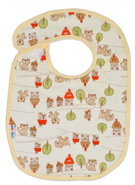 Barevný dětský bryndáček s veselými obrázky. Pohodlné a praktické zapínání na suchý zip. Materiál: Vrchní strana: 100% bavlna.