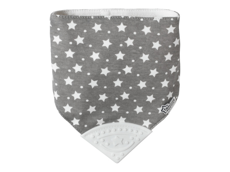 Stylový bryndák v podobě šátku z jemného bavlněného materiálu chrání oblečení dítěte před znečištěním během krmení. Součástí bryndáku je silikonové kousátko, které pomáhá ulevit citlivým dásním při prořezávání prvních zoubků.