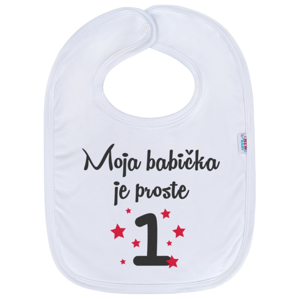 Krásný bavlněný dětský bryndáček s vtipným obrázkem New Baby. Bryndáček je zdoben nápisem Moja babička je proste 1. Barvy použité k potisku jsou certifikované a vhodné pro miminka. Je vyroben z příjemného a kvalitního materiálu. Bryndáček má bílé lemování a je vyroben ze dvou vrstev bavlněné látky. Zapínání na cvoček. Dětský bryndáček chrání oblečení miminka před znečištěním při jídle a pití. Složení: 100 % bavlna. Rozměry: dxs cca 36x26 cm.- Produkt české značky
