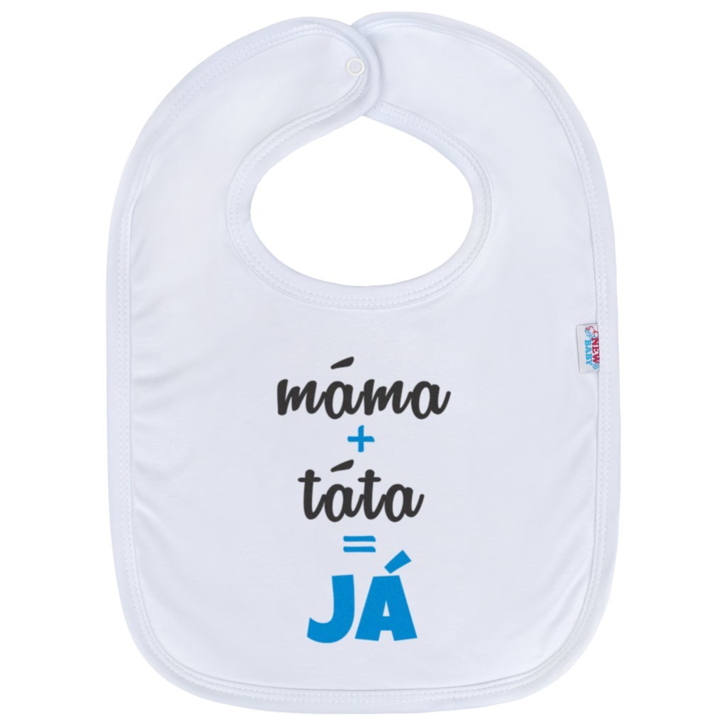 Krásný bavlněný dětský bryndáček s vtipným obrázkem New Baby. Bryndáček je zdoben nápisem máma+táta=JÁ. Barvy použité k potisku jsou certifikované a vhodné pro miminka. Je vyroben z příjemného a kvalitního materiálu. Bryndáček má bílé lemování a je vyroben ze dvou vrstev bavlněné látky. Zapínání na cvoček. Dětský bryndáček chrání oblečení miminka před znečištěním při jídle a pití. Složení: 100 % bavlna. Rozměry: dxs cca 36x26 cm.- Produkt české značky