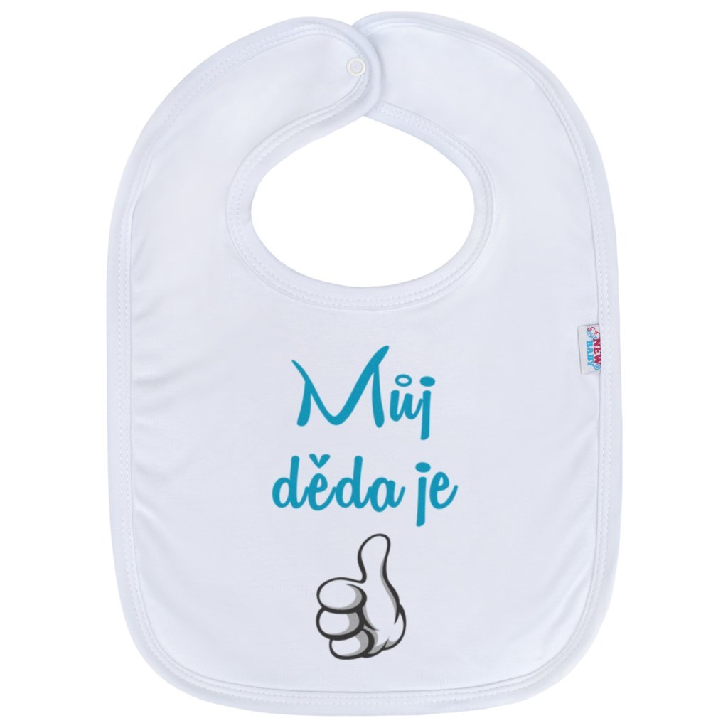 Krásný bavlněný dětský bryndáček s vtipným obrázkem New Baby. Bryndáček je zdoben nápisem Můj děda je 1. Barvy použité k potisku jsou certifikované a vhodné pro miminka. Je vyroben z příjemného a kvalitního materiálu. Bryndáček má bílé lemování a je vyroben ze dvou vrstev bavlněné látky. Zapínání na cvoček. Dětský bryndáček chrání oblečení miminka před znečištěním při jídle a pití. Složení: 100 % bavlna. Rozměry: dxs cca 36x26 cm.- Produkt české značky