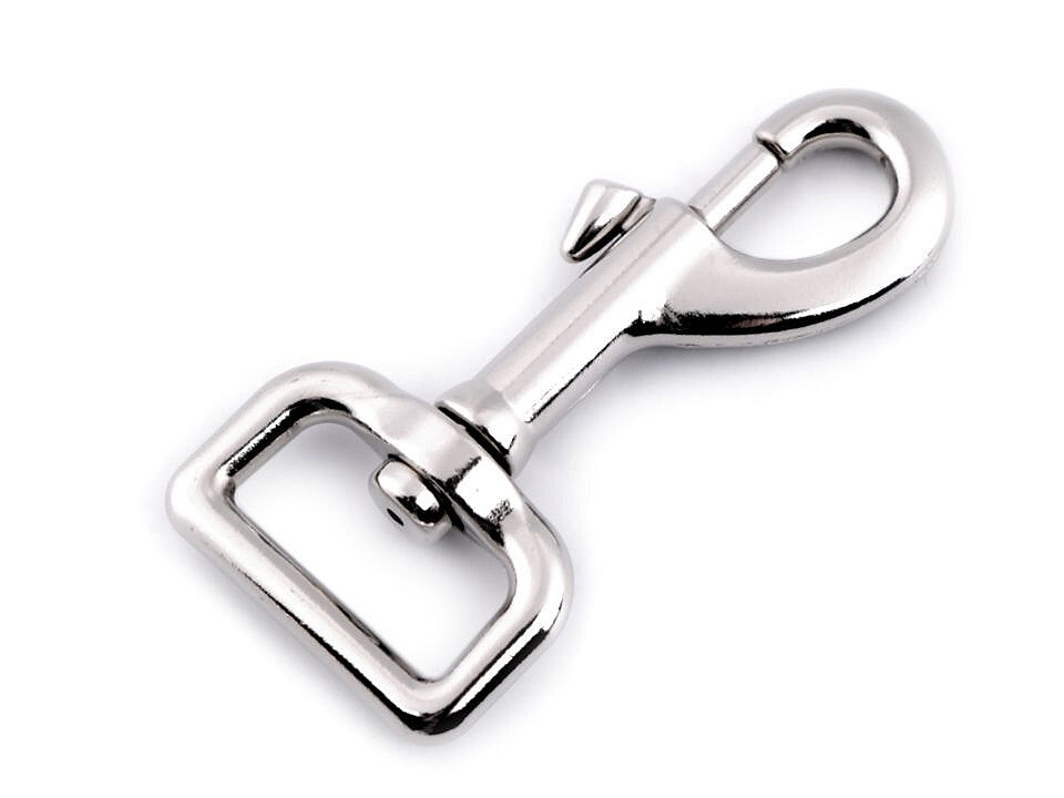Mohutnou kovovou karabinu využijete hlavně na výrobu vodítek pro velké rasy psů. Dále ji můžete použít na kabelky, sportovní tašky, kufry apod. Je otočná.