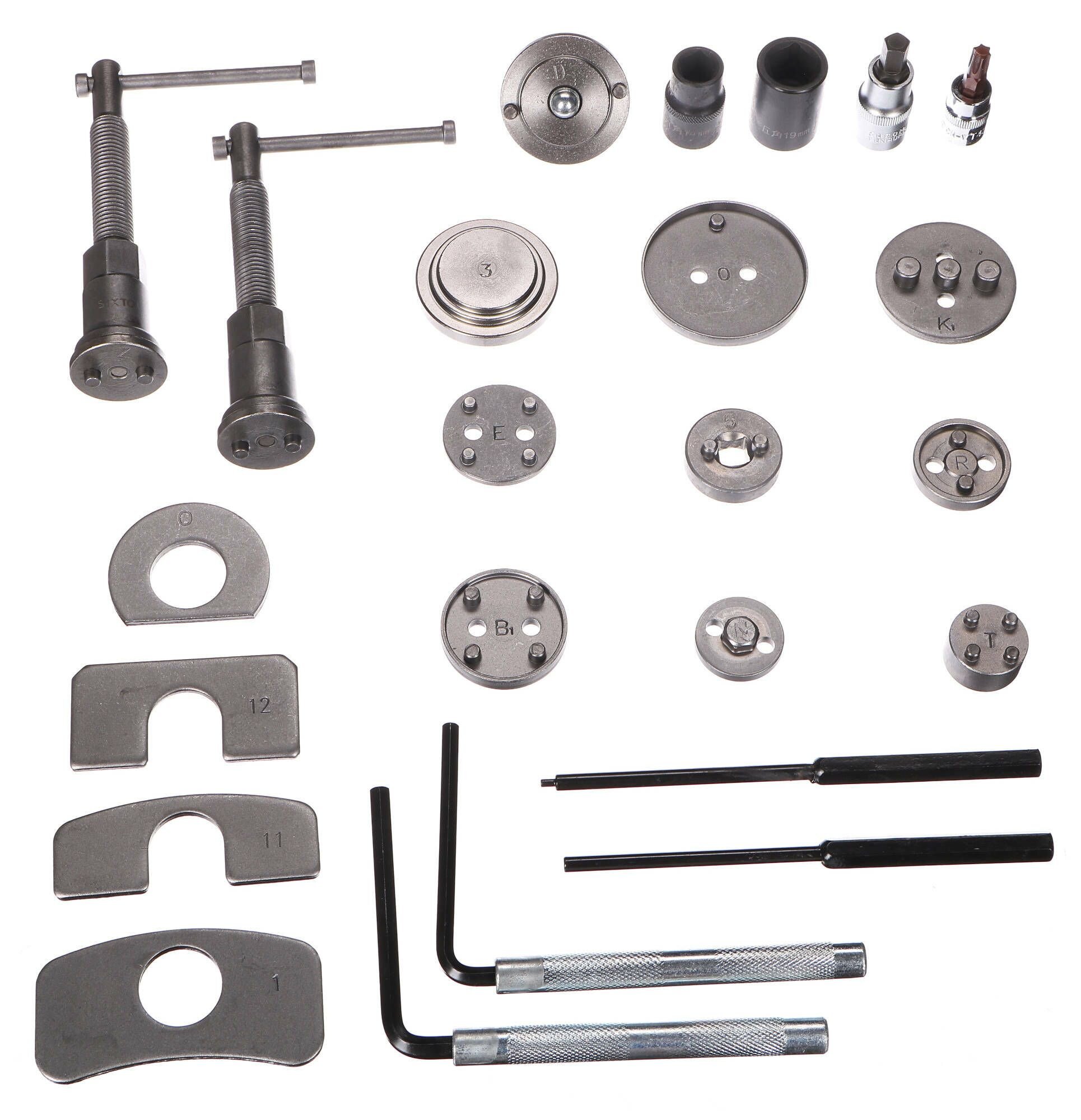 Ultimátní sada stlačováků brzdových pístů BRAKE SET BLACK s 50 díly v černém plastovém kufru vhodná k montáži/zpětnému vracení pístů/třmenů kotoučových brzd. Sada obsahuje pravotočivou i levotočivou stlačovací závitnici s magnetem, čtyři dorazy, dva imbusové klíče, úderníky, nádobku na mazivo a množství různých adaptérů. U vozidel s třmeny kotoučových brzd a s integrovanou jednotkou ruční brzdy se zpětné vracení brzdových pístů provádí zpětným otáčením, u ostatních vozidel zpětným stlačením těchto pístů.