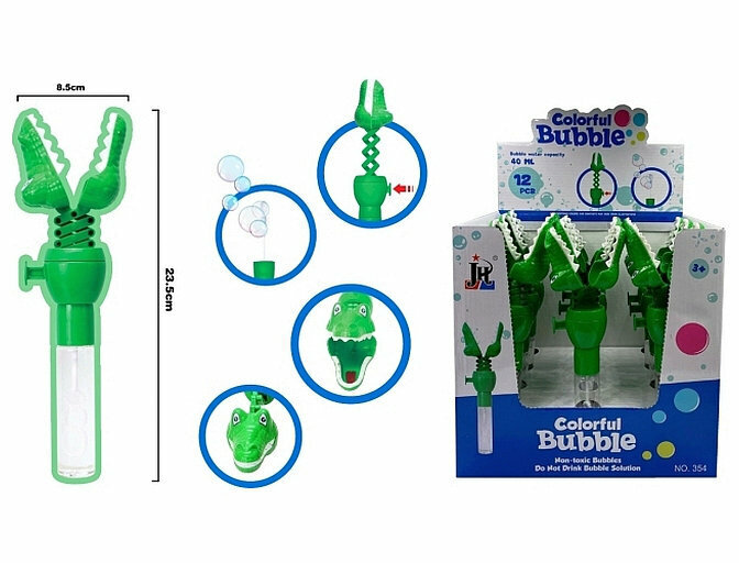 Zabawka Krokodyl z bańkami mydlanymi to wspaniały gadżet do zabawy na świeżym powietrzu i w domu.Zabawka znajduje się na plastikowej sprężynie. Po naciśnięciu przycisku na pojemniczku, krokodyl wystrzeli. Na dole znajduje się buteleczka z bańkami mydlanymi i końcówką do puszczania baniek. Zabawa bańkami ucieszy zarówno młodsze, jak i starsze dzieci. Gadżet 2w1 o wielkości 23 cm Odpowiednie dla dzieci powyżej 3 lat.