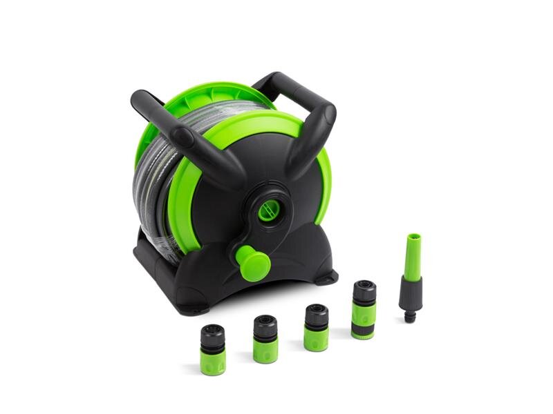 Tato zahradní polévací sada dokonale vyhovuje potřebám většiny domácností. Obsahem sady je kromě 15 metrů dlouhé hadice a úložného bubnu i postřikovací tryska, spojka na hadici a kohoutek (rychlospojky), které zajišťují pohodlné používání. Bubon se díky kompaktním rozměrům snadno přenáší těsněním zajišťuje snadné připojení ke stávajícím hadicím. 4 bary, 13 mm Ø hadice (1/2"), 15 m