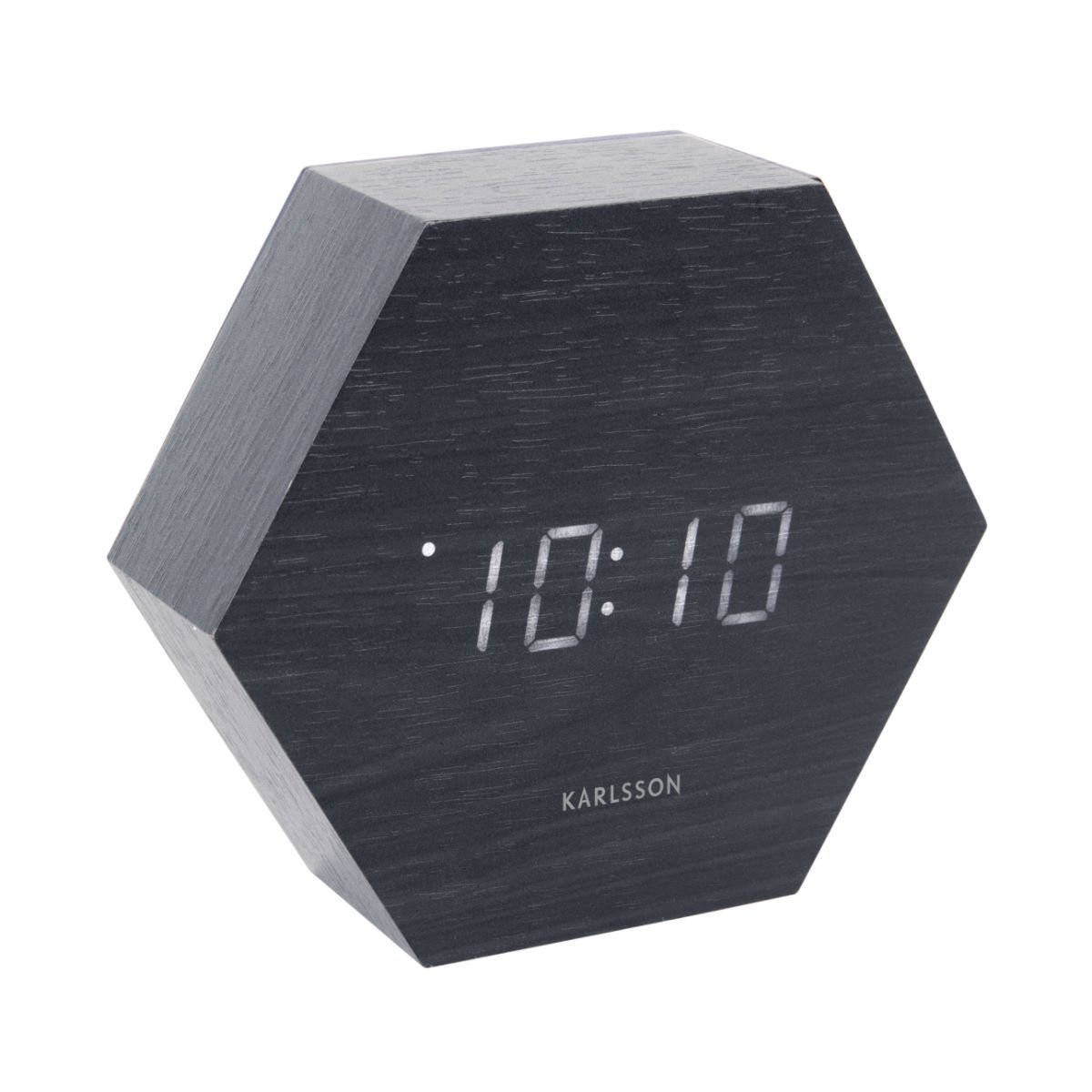 Designový budík s LED displejem a funkcí ukazatele hodin, data a teploty.