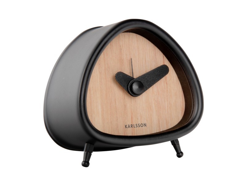 Krásný stolní budík, ve tvaru trojůhelníku s dřevěným motivem.