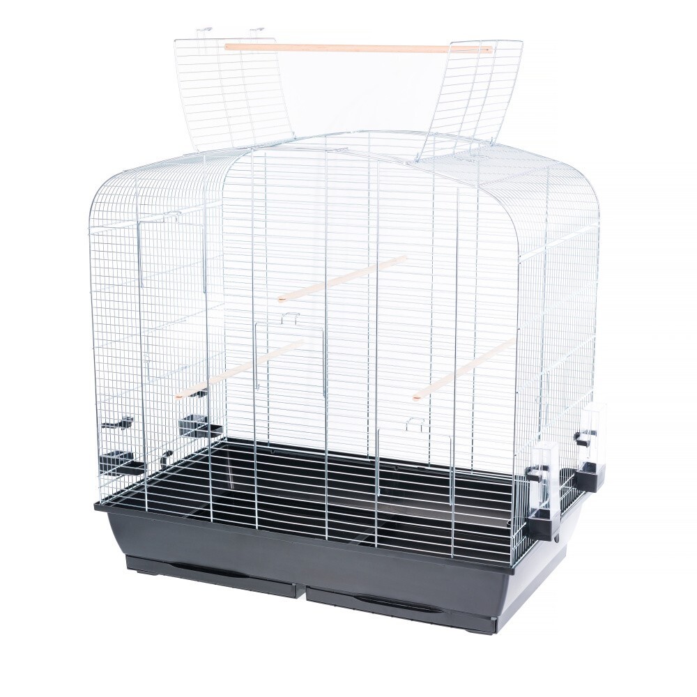 Klec pro ptactvo s otvíracím horním dílem a bidýlkem v elegantní barevné kombinaci.Vybavení: 5x dvířka (1x pravá strana, 1x levá strana a 3x přední strana), 3x bidýlko, 1x horní posezení, 4x krmítko/napáječkaDno klece má dva výsuvné šuplíky, díky kterým je čištění snadnější a pohodlnější.Barva: chromová barva drátu v kombinaci s černou barvou dnaRozměry: 78x48x79cmRozteč drátů: 1,5cmSíla drátů: 3 a 1,6mmVáha: 6,4kg