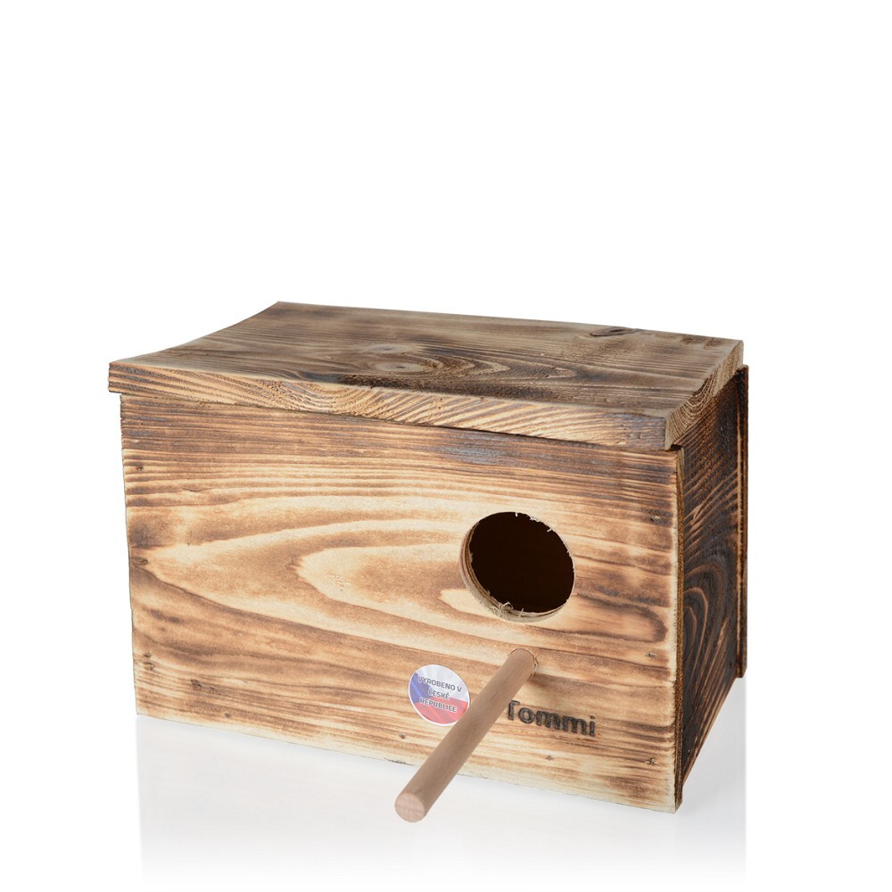Budka je vyrobena z kvalitního dřeva a obsahuje praktický hnízdní důlek, který ptákům umožňuje pohodlné usazení a klidné snášení vajec. Díky venkovnímu bidýlku mají ptáci snadný přístup do budky a zároveň prostor k odpočinku. Její rozměry 21 x 13 x 12 cm ji činí ideální velikostí pro andulky či jiné drobné exotické ptactvo.