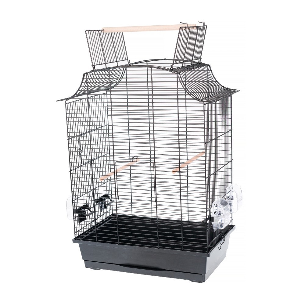 Jedná se o klec vhodnou pro chov středních a velkých papoušků. Součástí klece jsou čtyři krmítka a čtyři dřevěná bidýlka. Dno klece má výsuvný šuplík, díky němuž je čištění snadnější a pohodlnější. Klec má dvoje přístupová dvířka (jedny ze předu a druhé z boku). Horní část klece je otevíratelná a lze ji využít pro rozepření čtvrtého bidýlka (viz foto).• Rozměry: 49,5 x 30,5 x 66 (s otevřeným víkem 75) cm• Rozteč drátů: 10 mm• Barva drátů: černá• Barva dna: černá