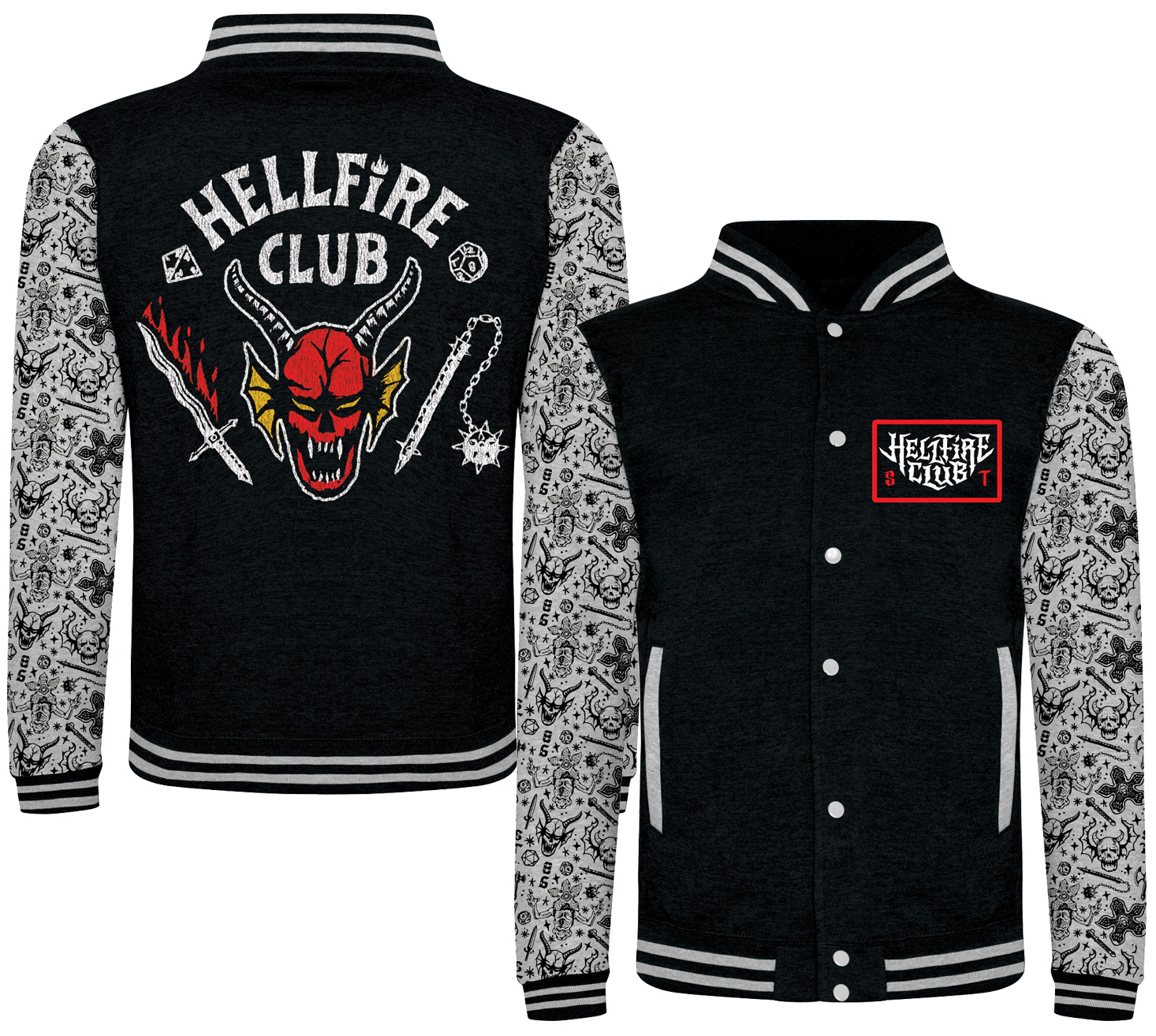 Atraktivní černá bunda s grafikou loga "Hellfire Club (společnosti studentů Hawkins High v čele s Eddiem Munsonem)" z oblíbeného seriálu Stranger Things: Season 4. Bunda je vhodná pro všechny fanoušky a hráče Dungeons & Dragons .