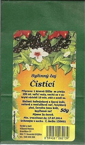 Bylinný čaj, sypaný Složení: heřmánkový a lipový květ, mátová a meduňková nať, fenyklový plod, květ černého bezu a kopřivová nať. Hmotnost: 50g Návod na přípravu: 1 sáček / lžičku na 250ml šálek, zalít vodou 100°C, louhovat 3-5 minutyVýrobce: Helena Vlčková, Braníškov 37, 664 71 Braníškov, Česká RepublikaSkladovat v suchu a chladu.