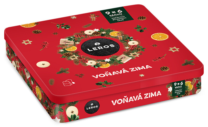 Užijte si sadu čajů Voňavá zima, která je v plechové kazetě a obsahuje 54 sáčků bylinných čajů.