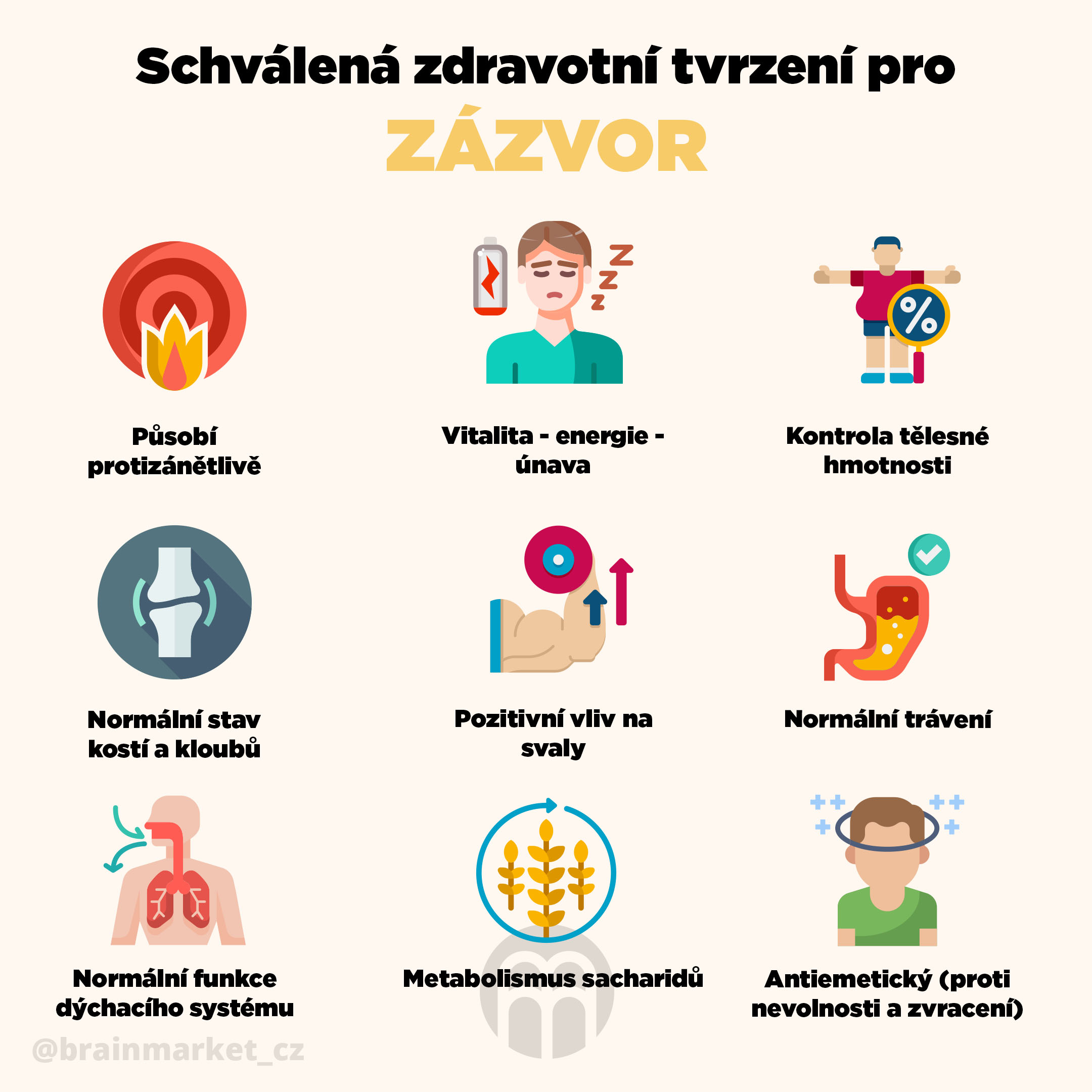 Lze jej použít při žaludečních nevolnostech, protože obsahuje sloučeninu gingerol. Jedná se o aktivní složku, která kromě zmírnění žaludečních potíží, také může pomoci při migréně. Zázvor má protizánětlivé vlastnosti, pozitivně působí na dýchací systém a je proto vhodný i při nachlazení. Zázvor má vysoký obsah vlákniny, která podporuje trávení a ve střevech působí jako prebiotikum. Prebiotika zvyšují počet zdraví prospěšných bakterií ve střevě. Více informací se dozvíte na BrainPedia.cz