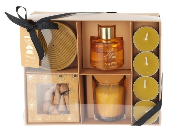 Sada vůní - vonný difuzér, svíčky, cementová podložka, vonný kužel, vůně Sunrise