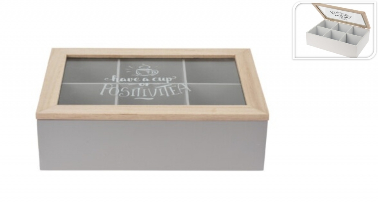 Dřevěná krabička na čaj je pravou volbou pro všechny, kteří si nedokáží představit ráno bez šálku lahodného čaje. Krabička má 6 přihrádek a průhledné víko s textem.
