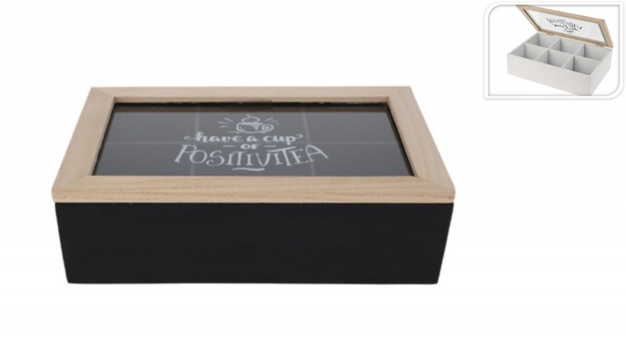 Krabička je vyrobena z kvalitních materiálů v černé barvě, která dodá vaší kuchyni stylový a nadčasový vzhled. Obsahuje šest přihrádek pro různé druhy čajů, takže si můžete snadno vybrat ten pravý na každou příležitost. Průhledné víko s jemným textem nejenže chrání čaj před prachem, ale zároveň umožňuje pohled na obsah, což usnadňuje výběr.
