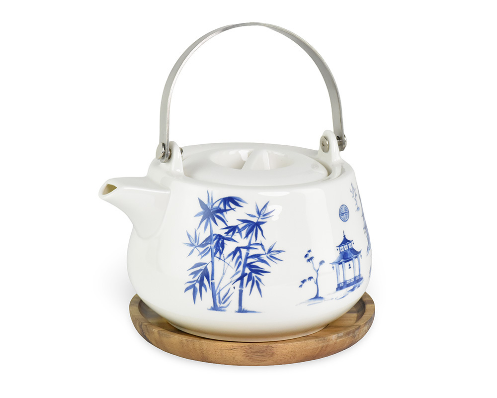 Čínská porcelánová konvice Pagoda s orientálním motivem pagody a dřevěným podstavcem.Parametry:Objem: 750 mlVýška konvičky: 18 cmŠířka: 16 cmPrůměr: 14 cmKonvička má zabudované hrubší keramické sítko.Průměr podstavce: 14 cmPorcelánové části jsou vhodné do myčky i mikrovlnky.Porcelánovou část setu lze použit v myčce i v mikrovlnce.