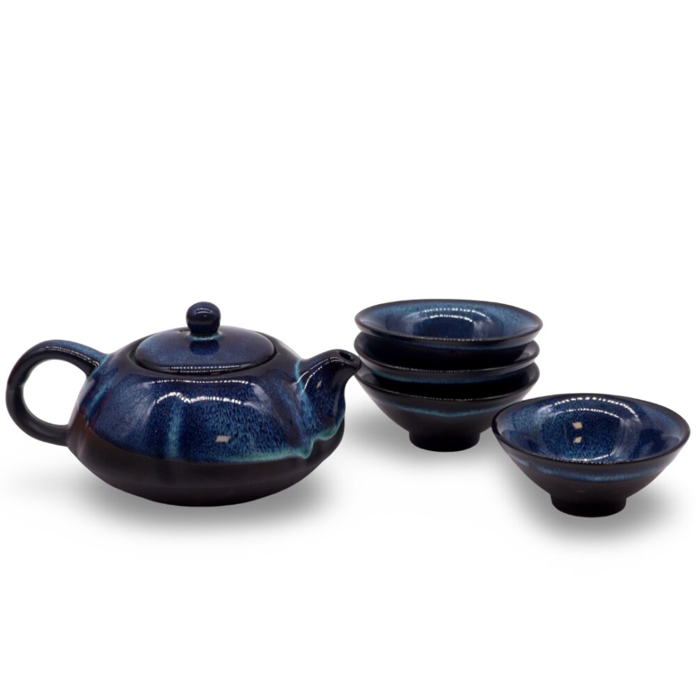 Keramická konvička s modrou glazurou a čtyřmi kalíšky - ručně zdobený čajový setTradičně laděná keramická konvička s elegantní modrou glazurou a čtyřmi jemnými kalíšky je ideální pro čajové rituály zaměřené na jeden druh čaje. Vnitřek konvičky je ponechán bez glazury, což umožňuje, aby se časem "nasytila" chutí konkrétního čaje - ideální pro milovníky čajových tradic. Ručně zdobený povrch a drobné odchylky v barevném tónu dělají z každého kusu originál. Vnější hnědá glazura v kombinaci s modrými detaily vytváří přirozený, klidný dojem.
