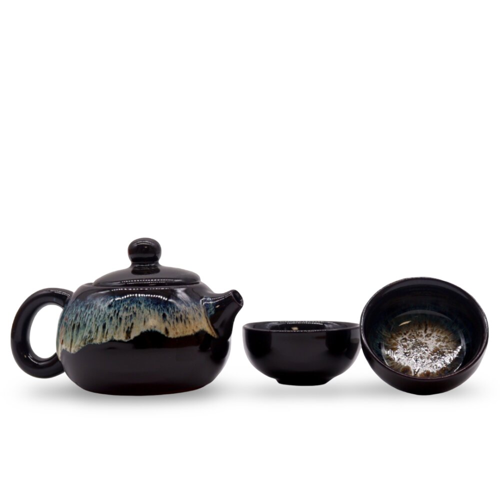 Konvička s hnědou glazurou a dvěma šálky - ručně glazovaná keramika Elegantní keramická konvička s hnědou glazurou a dvěma kalíšky je ideální pro vychutnání čaje v klidné atmosféře. Díky ručnímu barvení a žíhání je každý kus originál - barevné odstíny se mohou jemně lišit od fotografie, což každému setu dodává jedinečný charakter. Specifikace: Objem konvičky: cca 145 ml Objem šálků: cca 45 ml Rozměry konvičky: výška 5 cm (bez víčka) Rozměry šálků: průměr 6 cm, výška 2,5 cm Materiál: keramika s hnědou glazurou Sítko: nevyjímatelné, umístěné v ústí hubice Tento čajový set je vhodný pro ty, kteří ocení jednoduchost, funkčnost a estetiku tradiční ruční výroby.