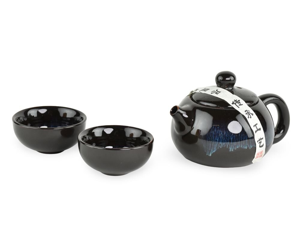 Konvička s hnědou glazurou a dvěma šálky - ručně glazovaná keramika Elegantní keramická konvička s hnědou glazurou a dvěma kalíšky je ideální pro vychutnání čaje v klidné atmosféře. Díky ručnímu barvení a žíhání je každý kus originál - barevné odstíny se mohou jemně lišit od fotografie, což každému setu dodává jedinečný charakter. Specifikace: Objem konvičky: cca 145 ml Objem šálků: cca 45 ml Rozměry konvičky: výška 5 cm (bez víčka) Rozměry šálků: průměr 6 cm, výška 2,5 cm Materiál: keramika s hnědou glazurou Sítko: nevyjímatelné, umístěné v ústí hubice Tento čajový set je vhodný pro ty, kteří ocení jednoduchost, funkčnost a estetiku tradiční ruční výroby.