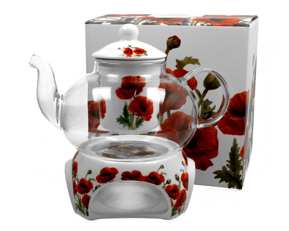 Konvička z tvrzeného skla se sítkem z porcelánu a nahříváčkem. Edici zdobí motiv makových květů. Vše je zabaleno v dárkové krabičce zdobené stejným motivem. Výborný tip na originální dárek k narozeninám pro ženu či muže, stejně jako na dárek pro šéfa či učitele, vhodné i jako poděkování.