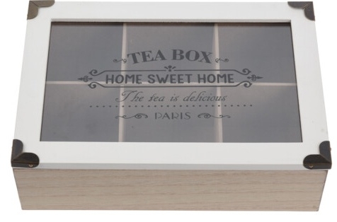 Moderní a stylová krabička na čaj s proskleným potištěným víkem a šesti přihrádkami.
