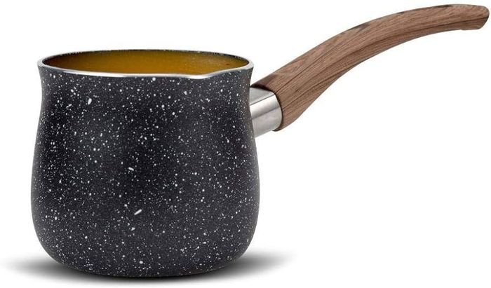 Džezva je vyrobena z vysoce kvalitního hliníku potaženého nepřilnavým pětivrstvým granitovým povlakem, který zajišťuje odolnost proti poškrábání i vysokým teplotám a zároveň usnadňuje čištění. Rukojeť je navržena tak, aby byla ergonomická, protiskluzová a tepelně odolná, což zaručuje pohodlné a bezpečné držení při přípravě kávy. Díky praktické hubici můžete kávu snadno nalévat bez zbytečného rozlívání.