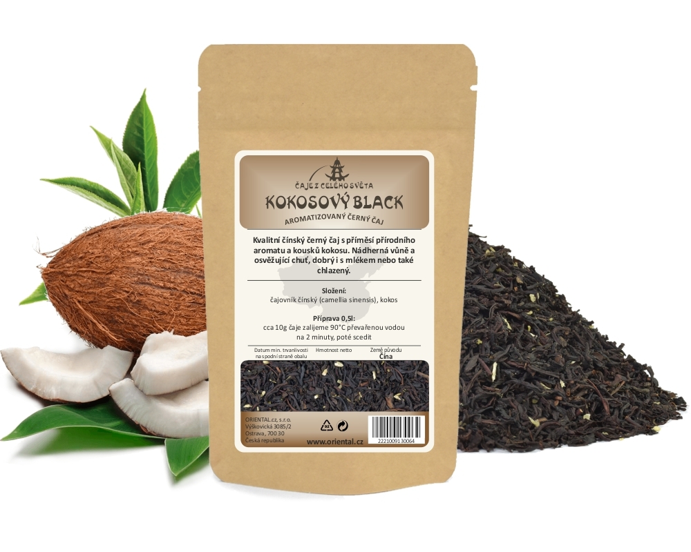 Složení: čínský černý čaj, kousky kokosu a aroma.