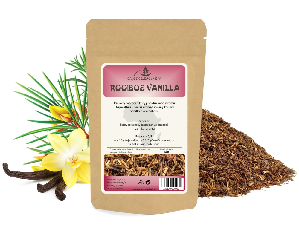 Rooibos, někdy také označován jako červený keř, je výborná alternativa ke klasickému čaji. Má jemnou lehce nasládlou chuť a lze ho dochucovat stejně jako čaj cukrem, medem či mlékem. Vyrábí se z keře Čajovníkovce kapského, který roste výhradně ve své domovině v Jihoafrické republice poblíž Kapského Města. Ručně se sklízí listy i větve a ty se následně mechanicky rozdrtí na malé kousky. Následuje fermentace, během které získá rooibos svoji typickou, červenohnědou barvu. Poté se zabalí a pozdrav z Afriky může putovat po světě.Složení: rooibos, vanilka a aroma.