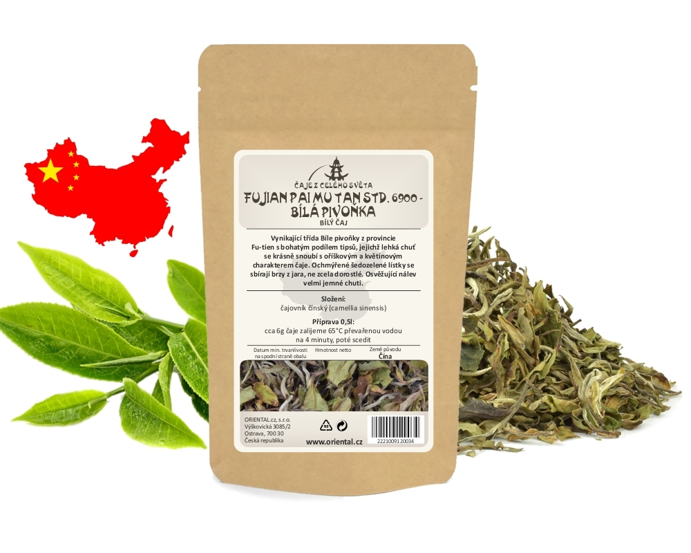Vynikající třída Bíle pivoňky z provincie Fu-tien s bohatým podílem tipsů, jejichž lehká chuť se krásně snoubí s oříškovým a květinovým charakterem čaje. Bílá pivoňka tvoří střed mezi čaji Yin Zhen a Shou Mee. Při sklizni se sbírá jeden ochmýřený vrcholový výhonek (tips) spolu s dvěma přilehlými lístky. Sběr obvykle probíhá brzy z jara, kdy jsou čajové keře po zimě plné živin potřebných pro růst listů. Přítomnost tipsů a mladších lístků vytváří osvěžující a povzbuzující nálev plný jemných a lahodně sladkých chutí. Vydrží několik nálevů, které vám umožní dokonale poznat veškeré chutě a vůně, které tento výtečný čaj ukrývá v lístcích.