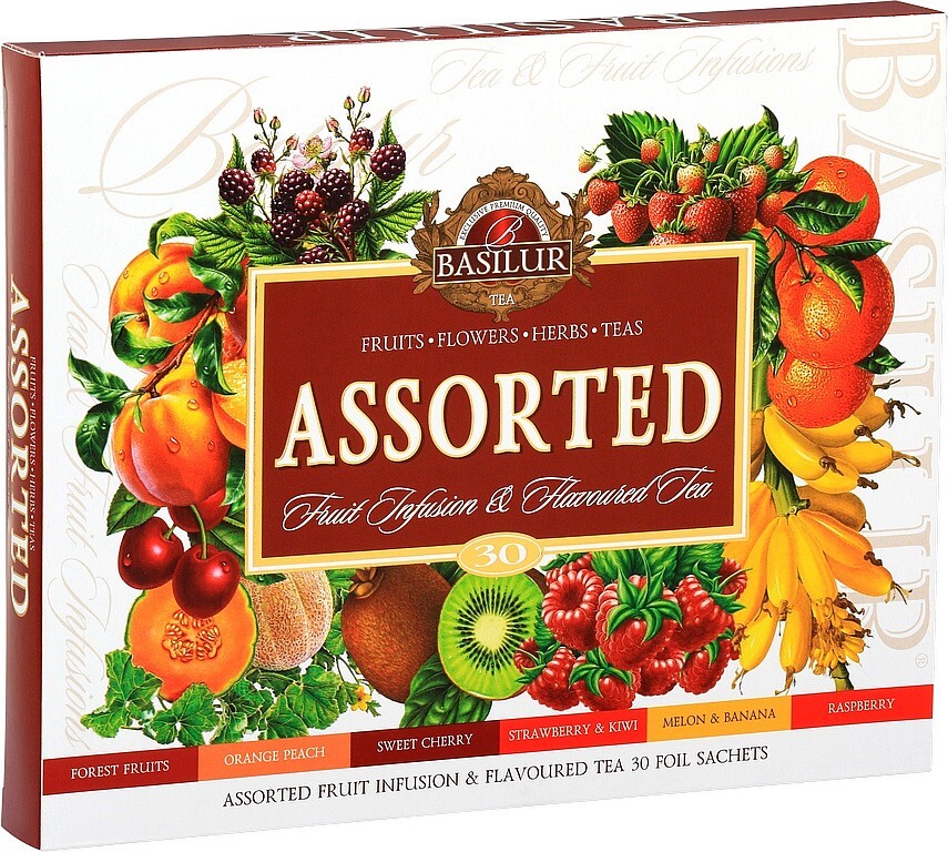 Směs ovocných, černých a zelených čajů aromatizovaná s ochucujícími částmi rostlin (kousky ovoce), porcovaná (1.8gx10 2gx10 1.5gx10)Složení: FOREST FRUIT - šípek plod 35 %, ibišek květ 40 %, pomeranč plod 10 %, granátové jablko plod 5 %, přírodní aroma (jahoda, mučenka, kyselina citronová), ORANGE PEACH - ibišek květ 54 %, čekanka list 15 %, pomeranč plod 12 %, ostružina list 12 %, přírodní aroma (pomeranč, broskev), SWEET CHERRY - černý čaj, aroma (třešeň), STRAWBERRY & KIWI - černý čaj 92,8 %, kiwi plod 0,2 %, aroma (jahoda, kiwi). MELON & BANANA - zelený čaj, aroma (banán, meloun), RASPBERRY - zelený čaj, aroma (malina) Hmotnost: 53g (1,8g x 10, 2g x 10 1,5g x 10) Návod na přípravu: 1 sáček na 250ml šálek, zalít vodou 80-100°C, louhovat 2-5 minutVýrobce: Basilur Tea Export (PVT) LTD. Baleno na Srí Lance. Dovozce pro ČR: MIX-TEE velkoobchod, s.r.o., Masarykova 235, 250 88 Čelákovice, Česká republikaSkladovat v suchu a chladu.