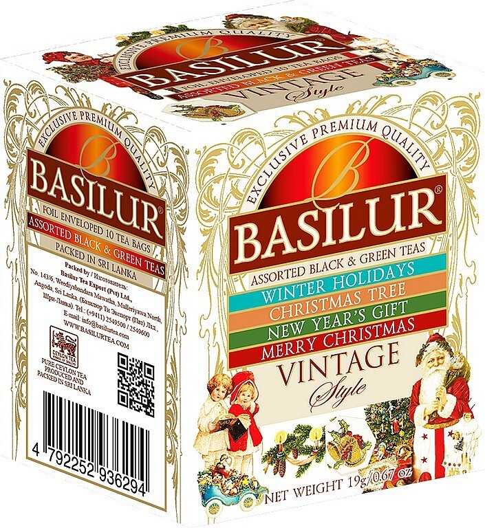 Dárková kolekce černých čajů a zeleného čaje, aromatizovaná, porcovanáSložení: WINTER HOLIDAYS - černý čaj, aroma (vanilka, jahoda, smetana), MERRY CHRISTMAS - černý čaj, aroma (zázvor, med, vanilka), NEW YEAR´S GIFT - černý čaj, aroma (třešeň, mandle), CHRISTMAS TREE - zelený čaj, aroma (mango, mučenka, limeta)Hmotnost: 19g (8x2g a 2x1,5g)Návod na přípravu: 1 sáček / lžičku na 250ml šálek, zalít vodou 100 (80)°C, louhovat 3-5 (2-3) minut(y)Výrobce: Basilur Tea Export (PVT) LTD. Baleno na Srí Lance. Dovozce pro ČR: MIX-TEE velkoobchod, s.r.o., Masarykova 235, 250 88 Čelákovice, Česká republikaSkladovat v suchu a chladu.