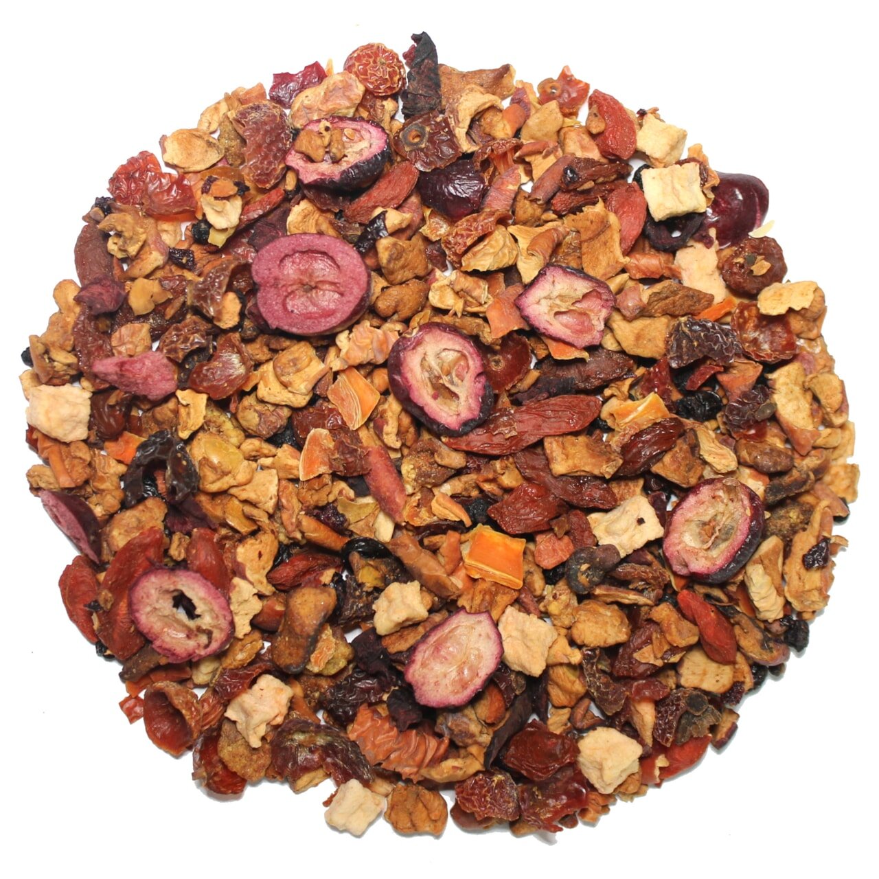Původní receptura Darka Tea z luxusní řady BAMBOO. Kustovnice obsahuje velký podíl vitamínů, minerálů a aminokyselin. Nálev není kyselé chuti, neobsahuje ibišek. Darka tip! Ledový čaj: Připravíme horký čaj podle návodu. Nálev necháme vychládnout. Přidáme přidat kostky ledu. Můžemke ozdobit lístky čerstvé meduňky. Složení: Jablka kousky, plody Goji (min. 18,5%), oplodí šípku, plody aronie, višně (5,5%), červená řepa, mrkev, hrušky, švestky kousky, aroma, borůvky