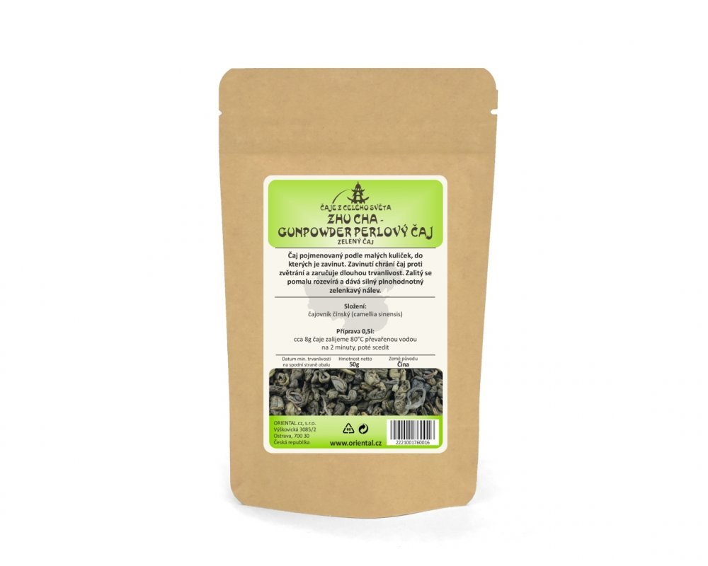 Čaj pojmenovaný podle malých světlých kuliček do kterých je zavinut, nazýván bývá také Perlový čaj. Zavinutí chrání čaj proti zvětrání a zaručuje dlouhou trvanlivost. Pro výrobu čaje se používají větší a starší lístky čajovníku. Poprvé byl tent očaj vyroben během dynastie Tang (618 - 907 nl) v provincii Zhejiang. V chuti se příjemně projevují kouřové tóny a příjemná travnatost. Typické je pronikavé aroma. Čerstvý si zachovává lesk a mírně nasládlou vůni. Po zalití vodou se lístky pomalu rozvíjejí a pouští se do čajového tance, který je požitkem pro pohled. Oblíbený saharskými kmeny pro svoji lahodnou chuť a sílu. V arabských zemích si připravují Gunpowder s mátou a cukrem.