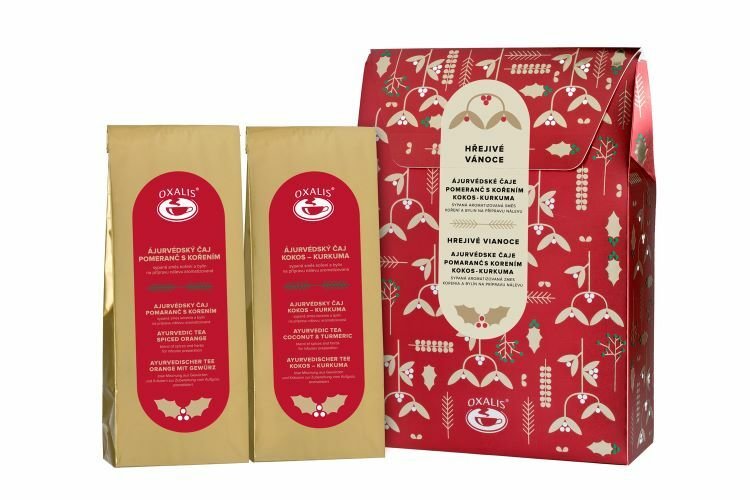 OXALIS Dárkové balení čajů - Hřejivé Vánoce je skvělým dárkem i požitkem pro všechny milovníky voňavých a zdravých čajů. Dopřejte si nebo svým blízkým chvíle relaxace a tepla se směsí dvou ájurvédských čajů, které jsou naplněné chutí i vůní tradičních koření.