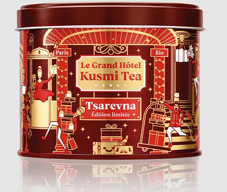 Limitovaný vánoční čaj Kusmi Tea Tsarevna. Organický černý čaj s podmanivým aroma pomerančů, koření, vanilky a mandlí v nádherné červenozlaté dóze dekorované motivy bujarvé vánoční oslavy z luxusního lobby Grand Hotelu Kusmi Tea.