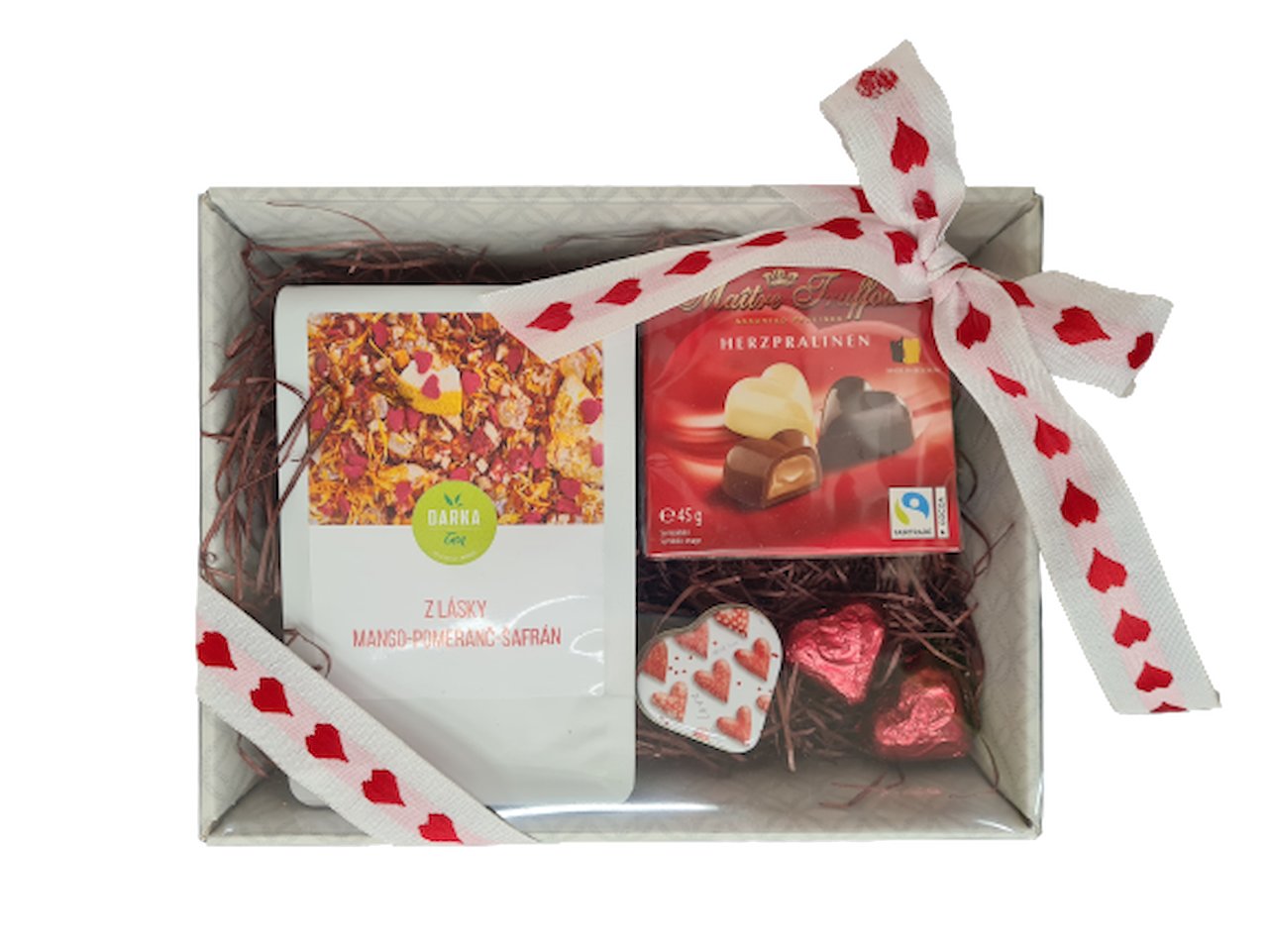 Dárková kazeta Z lásky: Originální dárková kazeta prémiový sypaný ovocný čaj s kousky manga, pomeranče, ananasu, lyofilizovaných jahod, pravého šafránu a cukrových srdíček. Dále v koši najdete marcipánová srdíčka Fairtrade, plechové srdíčko a belgické pralinky. To vše zabaleno v luxusním dárkovém koši s bílou mašlí s červenými srdíčky. Složení dárkové kazety Z lásky: Z lásky - Mango-Pomeranč-Šafrán - ovocný čaj 120 g: Složení: pomeranč kousky, lyofilizované ananas kousky, lyofilizované mango kousky, divoký šafrán, lyofilizované jahody, cukrová srdíčka, přírodní aroma. Belgické pralinky Srdce Fairtrade 45 g: Pralinky plněné lískooříškovým krémem 60% polité mléčnou, hořkou a bílou čokoládou. Složení: cukr, rostlinné tuky (řepkový, palmový, slunečnicový), kakaové máslo, sušené plnotučné mléko, kakaová hmota, lískové ořechy 2% (nízkotučný kakaový prášek, sladká sušená syrovátka (z mléka), emulgátor, lecitin (sója), bezvodého mléčného tuku, přírodní vanilkové aroma. Hořká čokoláda: obsah kakaové sušiny nejméně 53%. Mléčná čokoláda: obsah kakaové sušiny nejméně 34%. Může obsahovat stopy lepku a jiných ořechů.