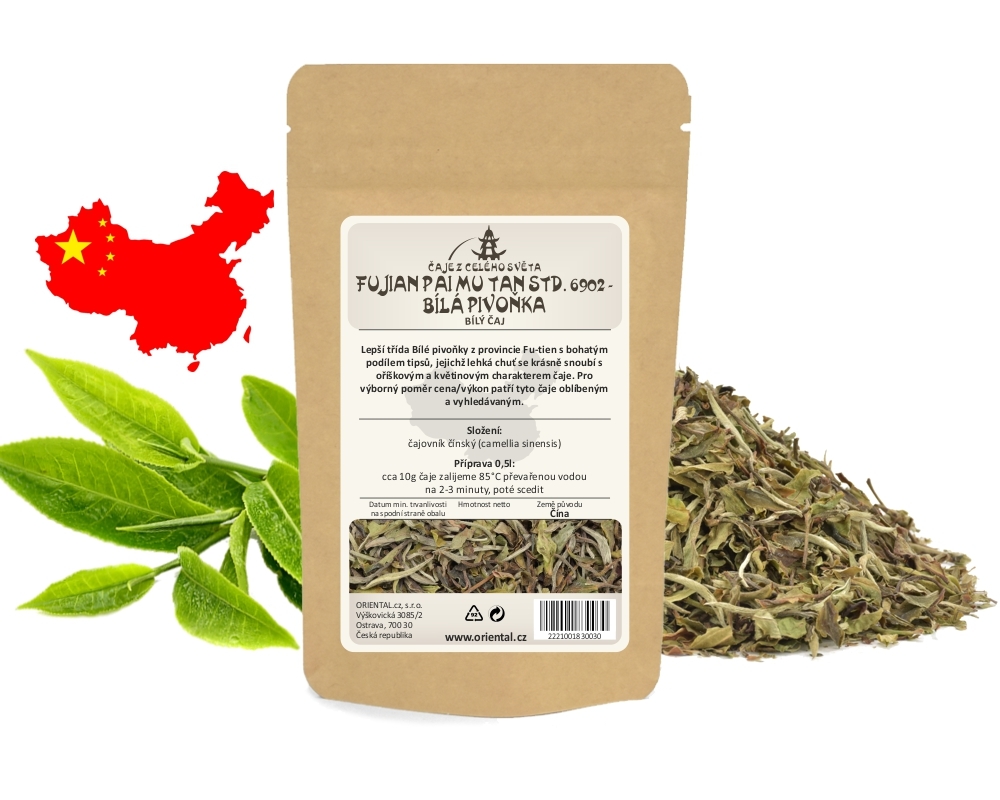 Lepší třída Bílé pivoňky z provincie Fu-tien s bohatým podílem tipsů, jejichž lehká chuť se krásně snoubí s oříškovým a květinovým charakterem čaje. Bílá pivoňka tvoří střed mezi čajem Yin Zhen a Shou Mee. Při sklizni se sbírá jeden ochmýřený vrcholový výhonek (tips) spolu s dvěma přilehlými lístky. Sběr obvykle probíhá brzy z jara, kdy jsou čajové keře po zimě plné živin potřebných pro růst listů. Přítomnost tipsů a mladších lístků vytváří osvěžující a povzbuzující nálev plný jemných a lahodně sladkých chutí. Vydrží několik nálevů, které vám umožní dokonale poznat veškeré chutě a vůně, které tento výtečný čaj ukrývá v lístcích.