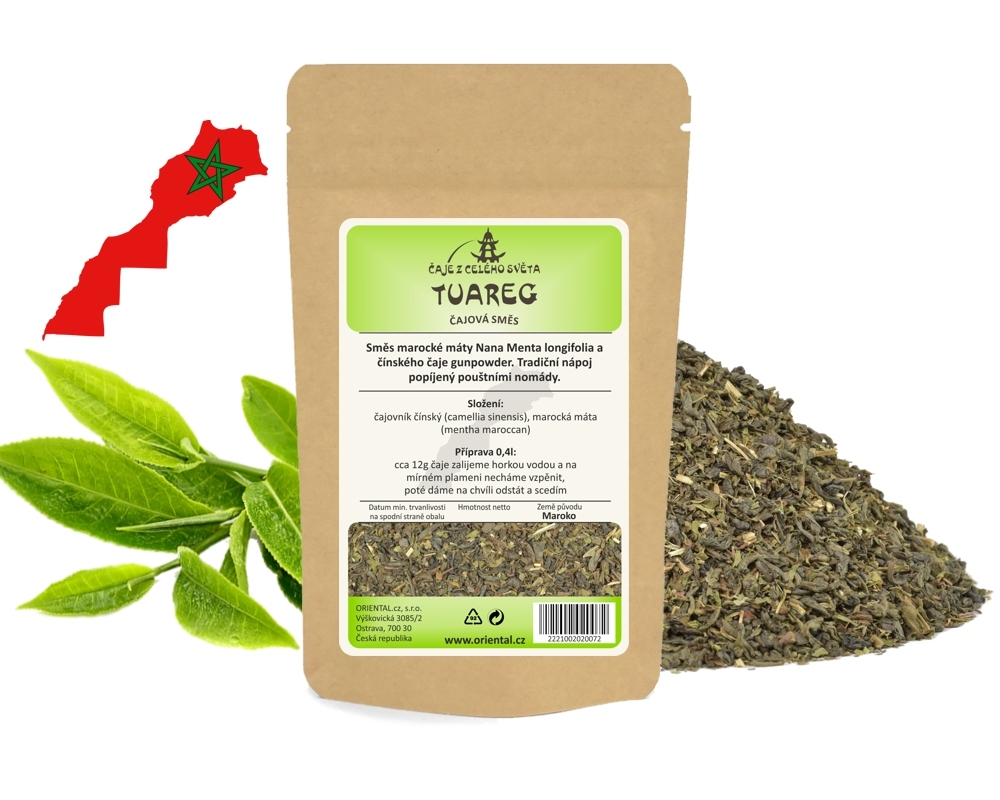 Není nad to poznávat kulturu cizích zemí skrze jejich tradiční nápoje a jídla. V Maroku je takovým nápojem Tuareg. Představuje sociální prvek a bývá také součástí prodeje a obchodu, prodejci na trhu vám jej často nabídnou během návštěvy jejich stánku. Je neslušné odmítnout nebo sjednávat cenu během podávání. Marocká máta v porovnání s českou mátou jemnější a není tolik pronikavá a výrazná, avšak stále přijemně pikantní. Čínský zelený čaj Gunpowder propůjčuje směsi ovocné prvky, znatelnější svíravost a svěžest. V Maroku je Tuareg považován za dezertní čaj, neboť dobře doplňuje celou řadu jídel - vyjma dezertů také jehněčí maso, hrášek nebo ovocné saláty. Pije se silný čaj obvykle výrazně slazený. Velmi osvěžující a vysoko energetický.Složení: čajovník čínský (camellia sinensis), marocká máta (mentha maroccan)