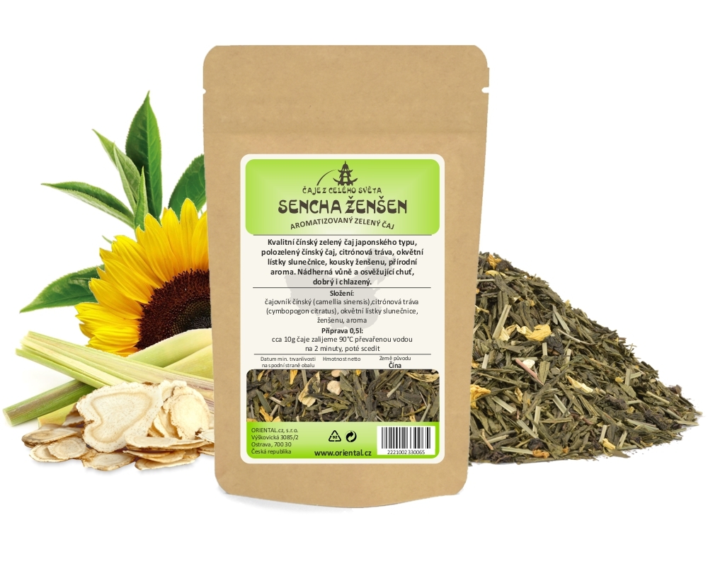 Složení: zelený čaj Sencha a polozelený čínský čaj, citrónová tráva, slunečnice, kousky ženšenu, přírodní aroma.