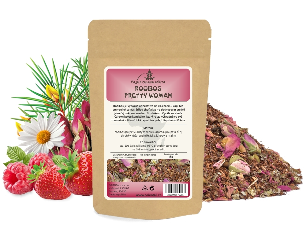 Rooibos, někdy také označován jako červený keř, je výborná alternativa ke klasickému čaji. Má jemnou lehce nasládlou chuť a lze ho dochucovat stejně jako čaj cukrem, medem či mlékem. Vyrábí se z keře Čajovníkovce kapského, který roste výhradně ve své domovině v Jihoafrické republice poblíž Kapského Města. Ručně se sklízí listy i větve a ty se následně mechanicky rozdrtí na malé kousky. Následuje fermentace, během které získá rooibos svoji typickou, červenohnědou barvu. Poté se zabalí a pozdrav z Afriky může putovat po světě.