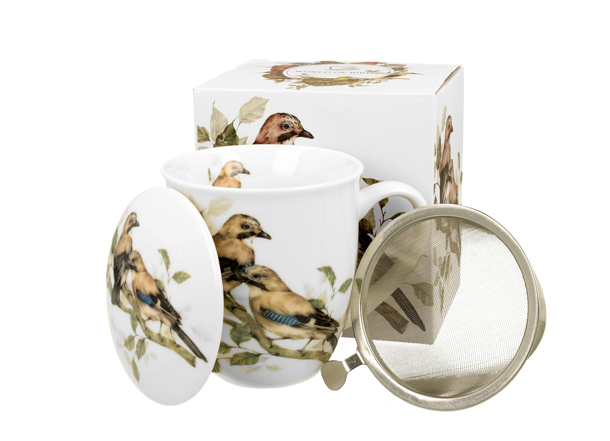 Kubek z zaparzaczem Ptasi Świat SÓJKI ZWYCZAJNE wchodzący w skład serii Animals, wykonany z porcelany New Bone China, charakteryzującej się naturalnym kremowo-białym kolorem z delikatnym połyskiem oraz wyjątkową wytrzymałością i trwałością, zachowując lekkość i finezję.